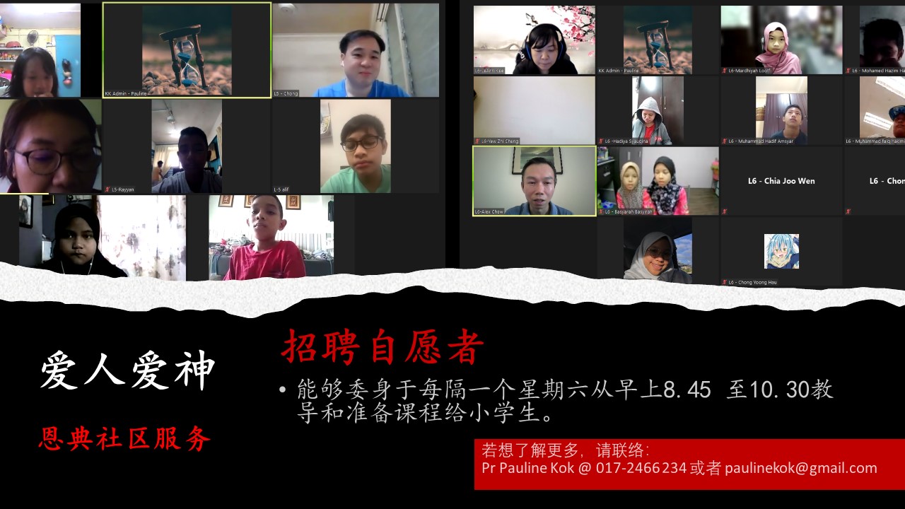 在这新常态环境,我们向贫困家庭提供了提供线上教学,因此需要更多自愿者一起。自愿者必须能够委身于每隔一个星期六从早上8点45分至10点30分教导和准备合成给小学生。