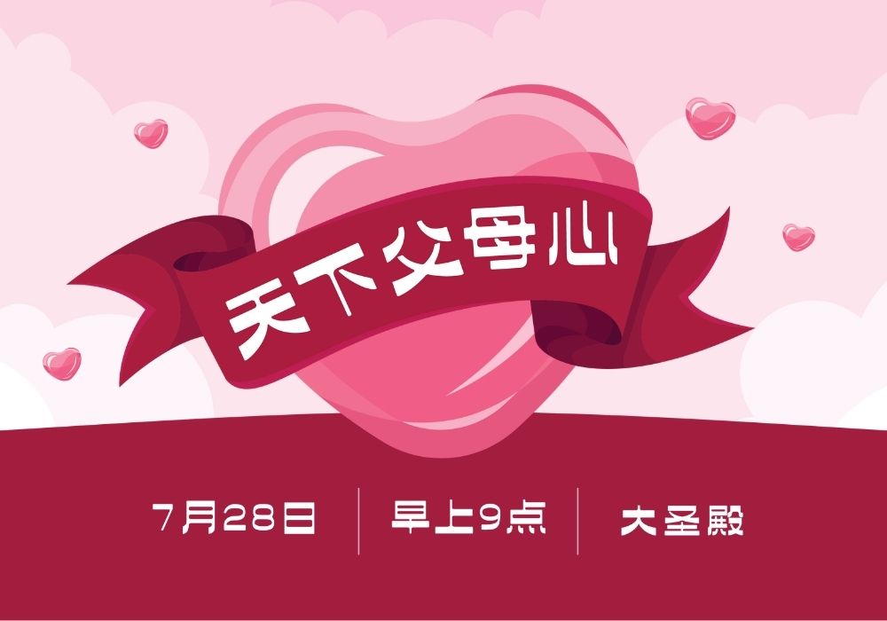诚挚邀请您和家人参加双亲节主日聚会! 双亲节是感恩父母、表达孝心的重要节日。 借此机会,邀请您和家人一起出席,共同感恩父母养育之恩。 教会还会送出一份精美的礼物给父母们!