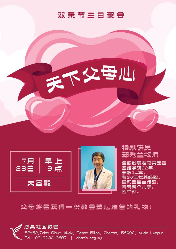 日期:7月28日,星期日 时间: 早上9点 地点:大圣殿,恩典社区教会 特别讲员:郑秀兰牧师