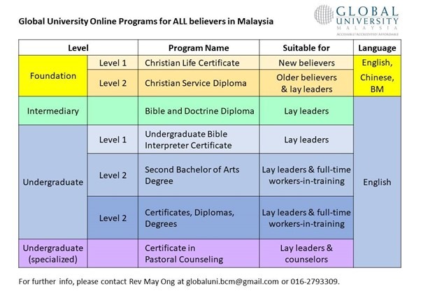 在马来西亚,全球大学办公室由马来西亚圣经学院 (BCM) 来运作。我们推广,协调并为三间学校开始课程: